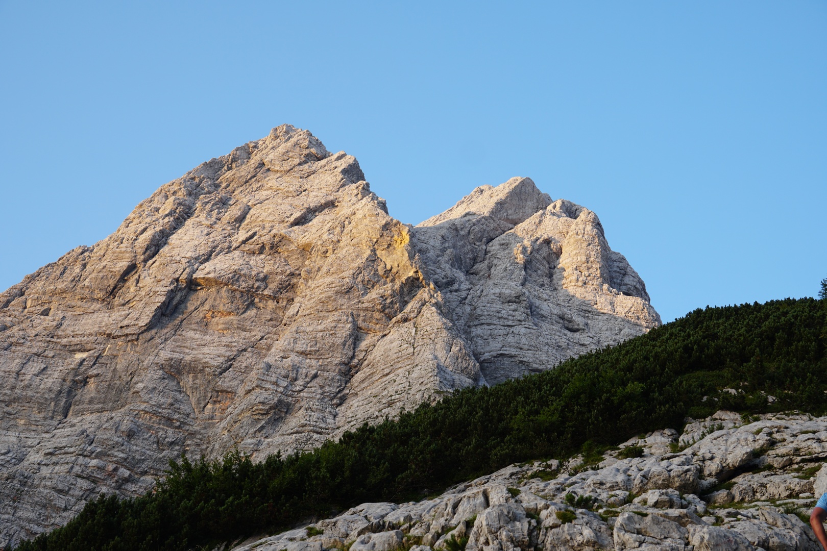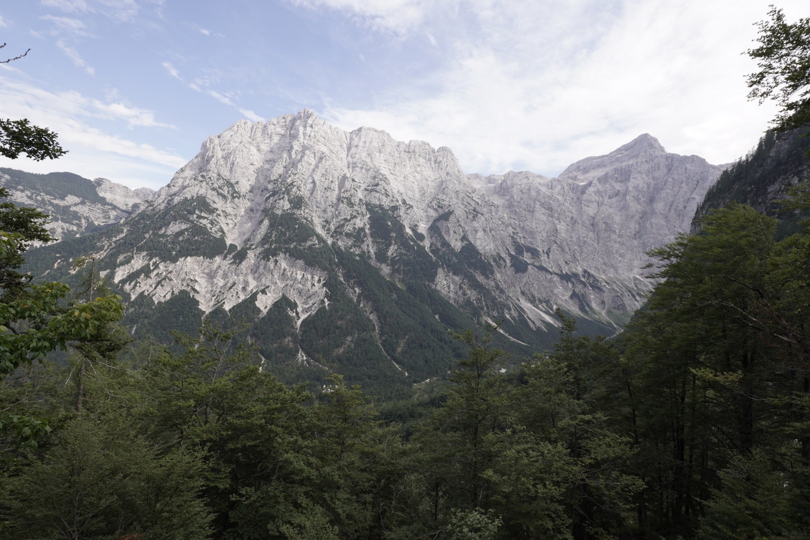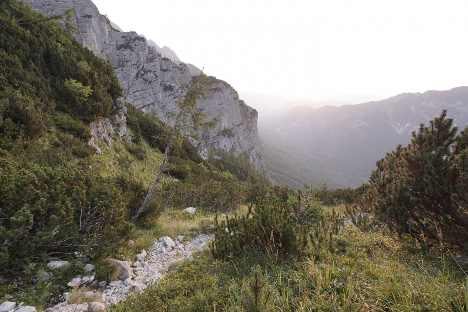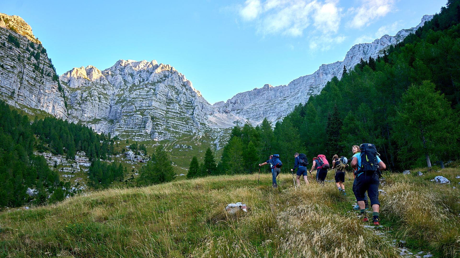 Zjutraj smo parkirali malo naprej od skakalnic, kjer smo začeli naš krožni pohod. Pot nas je najprej vodila po markirani stezi proti Grlu, sprva po prijetnem gozdnem kolovozu, ki se kasneje spremeni v strmejšo planinsko pot, obdano s smrekami in macesni. Ta del poti je mestoma precej krušljiv, zato smo za varnost nadeli čelade. Višje, ko smo se dvigali, so se pred nami začeli odpirati čudoviti pogledi na dolino Tamar in mogočno severno steno Jalovca, ki je spremljala naš vzpon skoraj ves čas.