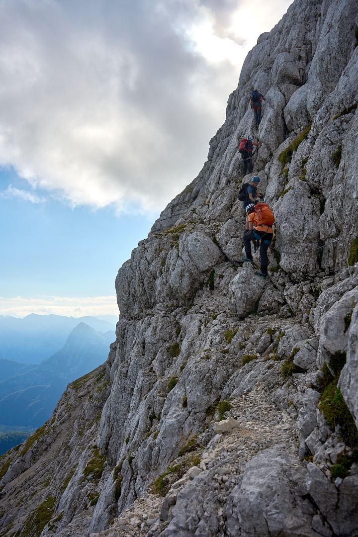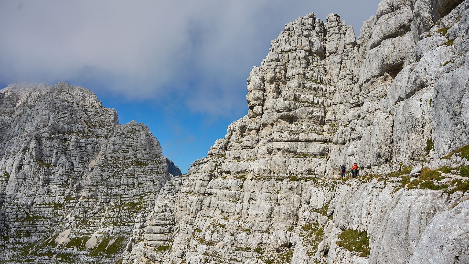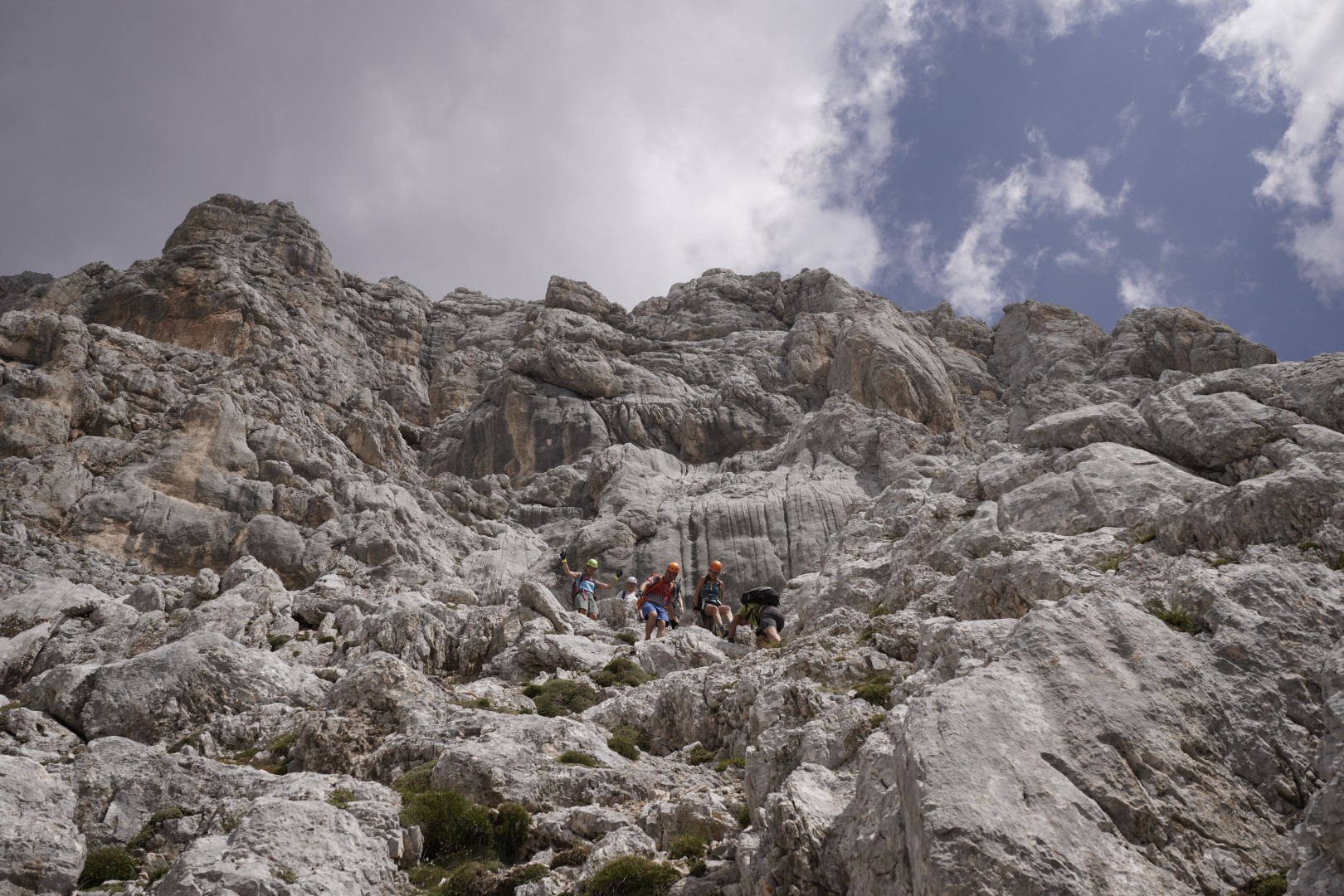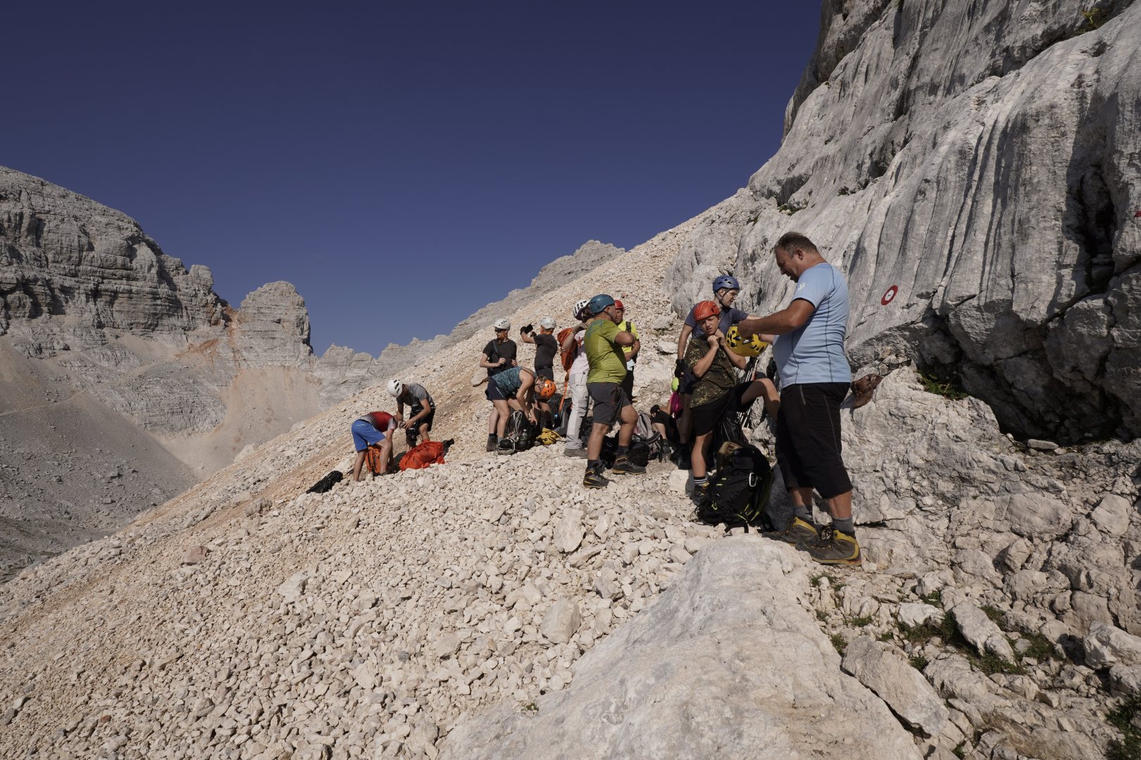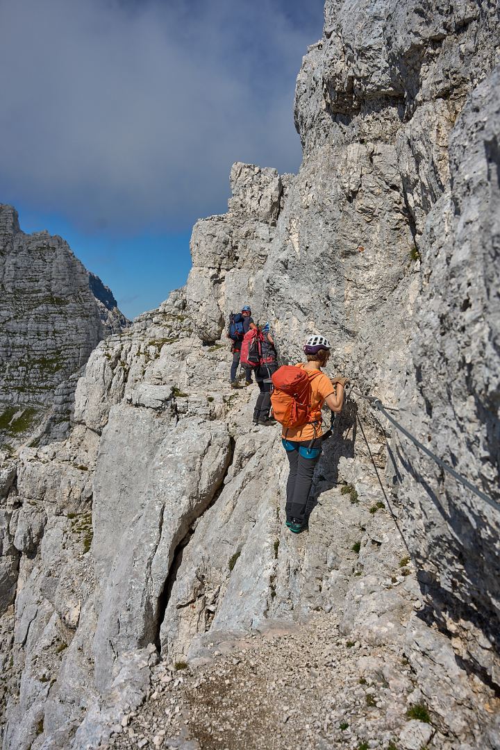kompleti, vstopili v steno Špika nad Špranjo (2554 m). Pot je ves čas izpostavljena in