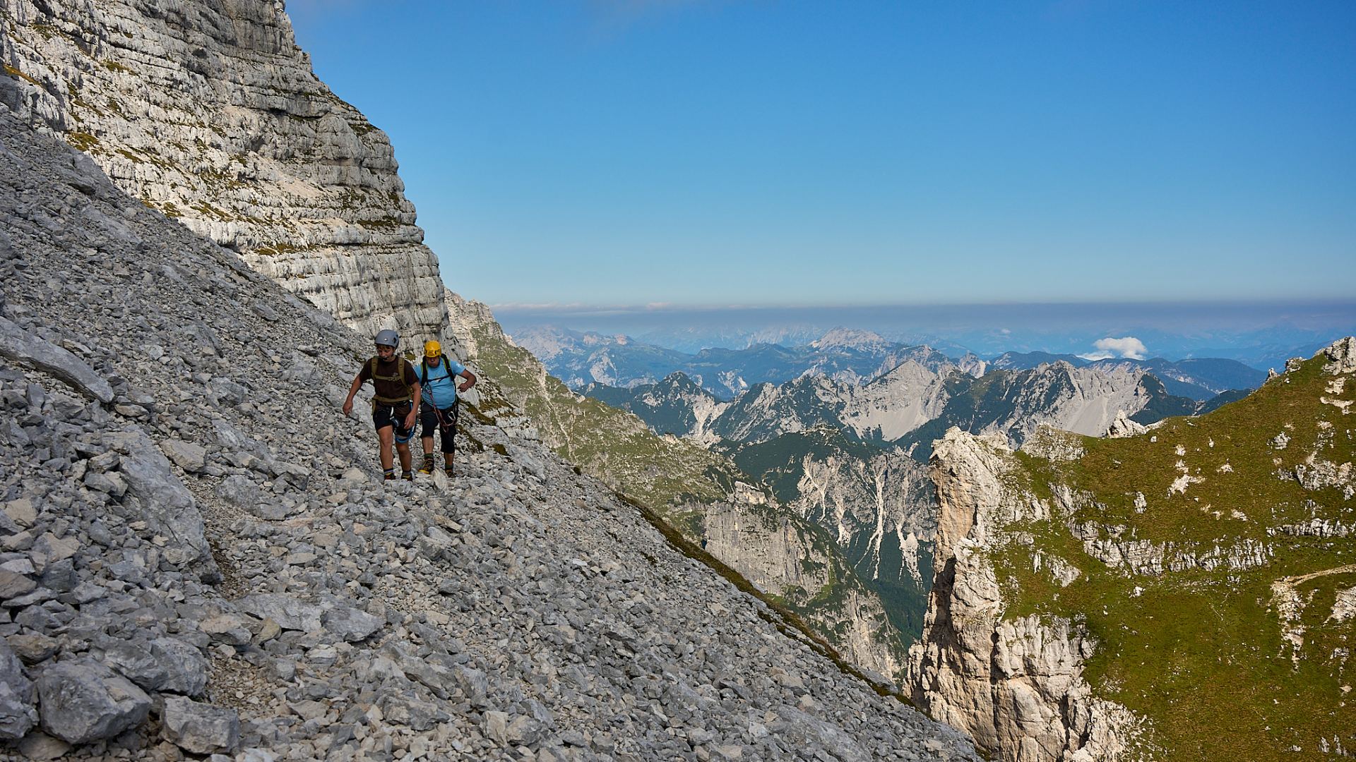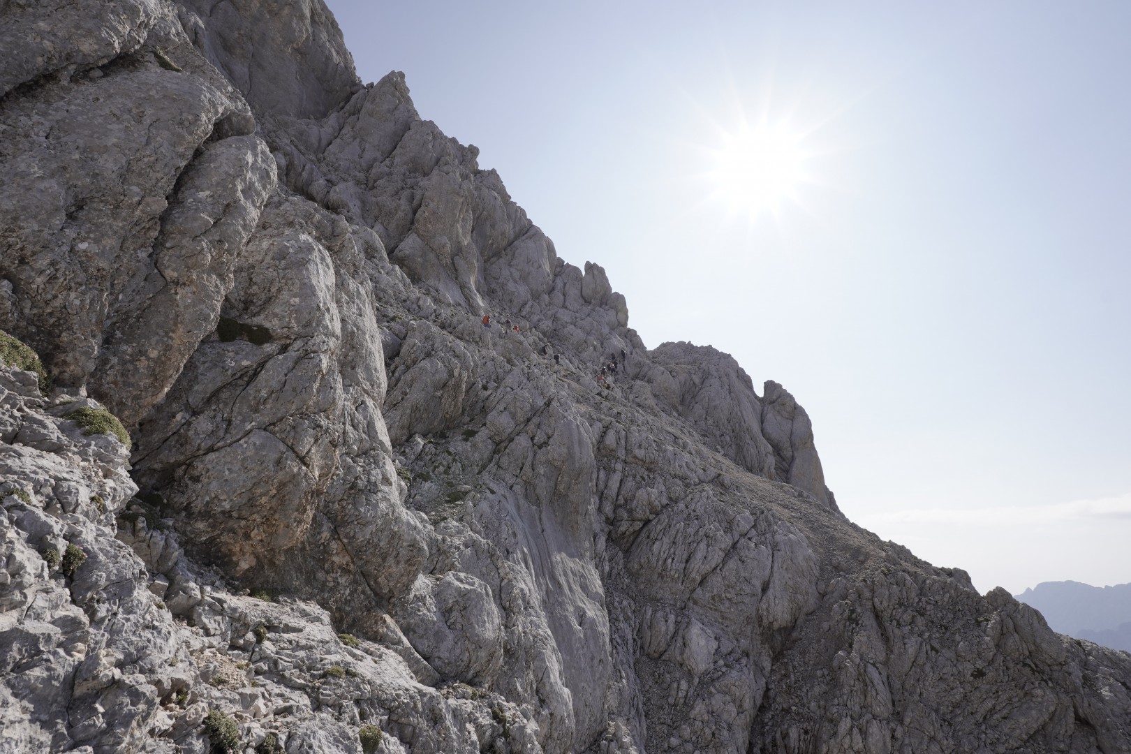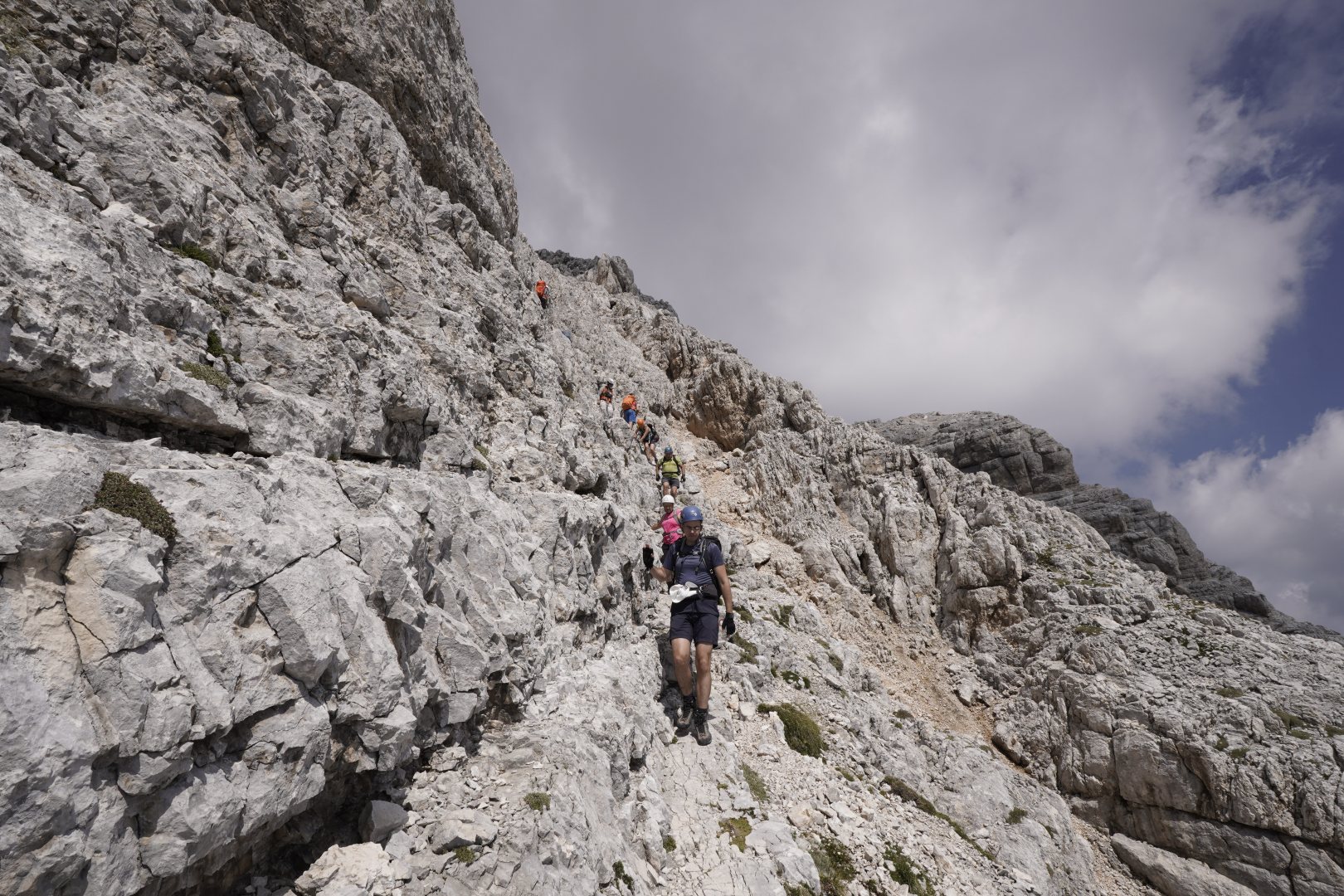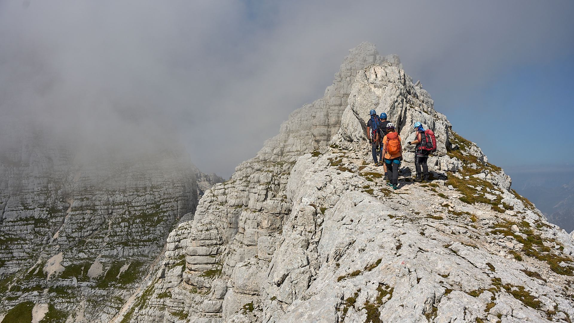 kompleti, vstopili v steno Špika nad Špranjo (2554 m). Pot je ves čas izpostavljena in