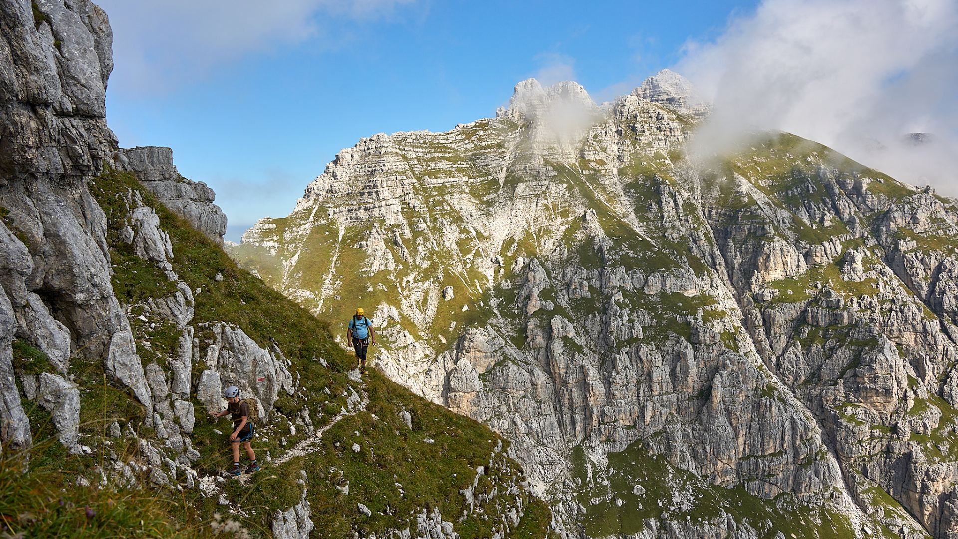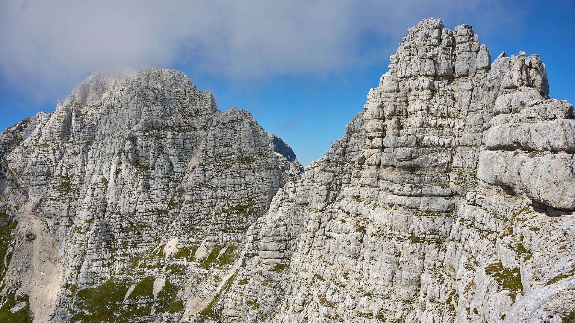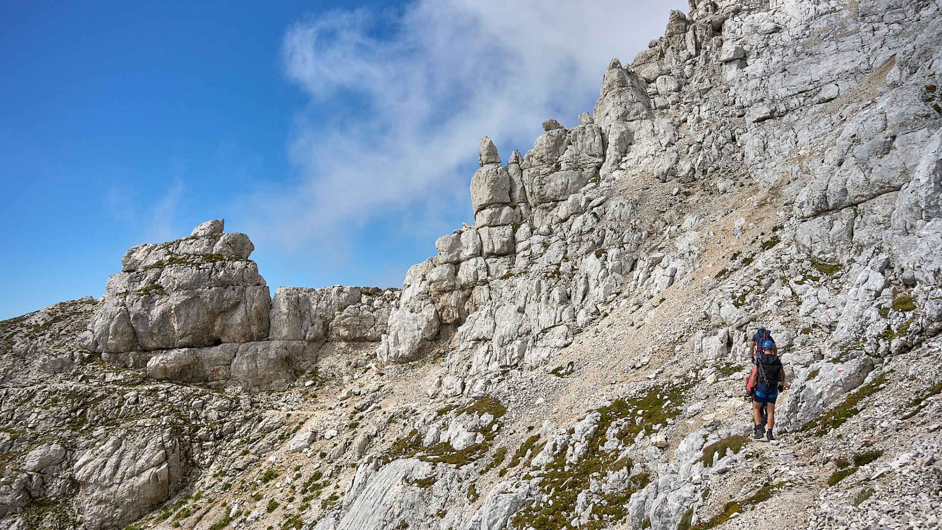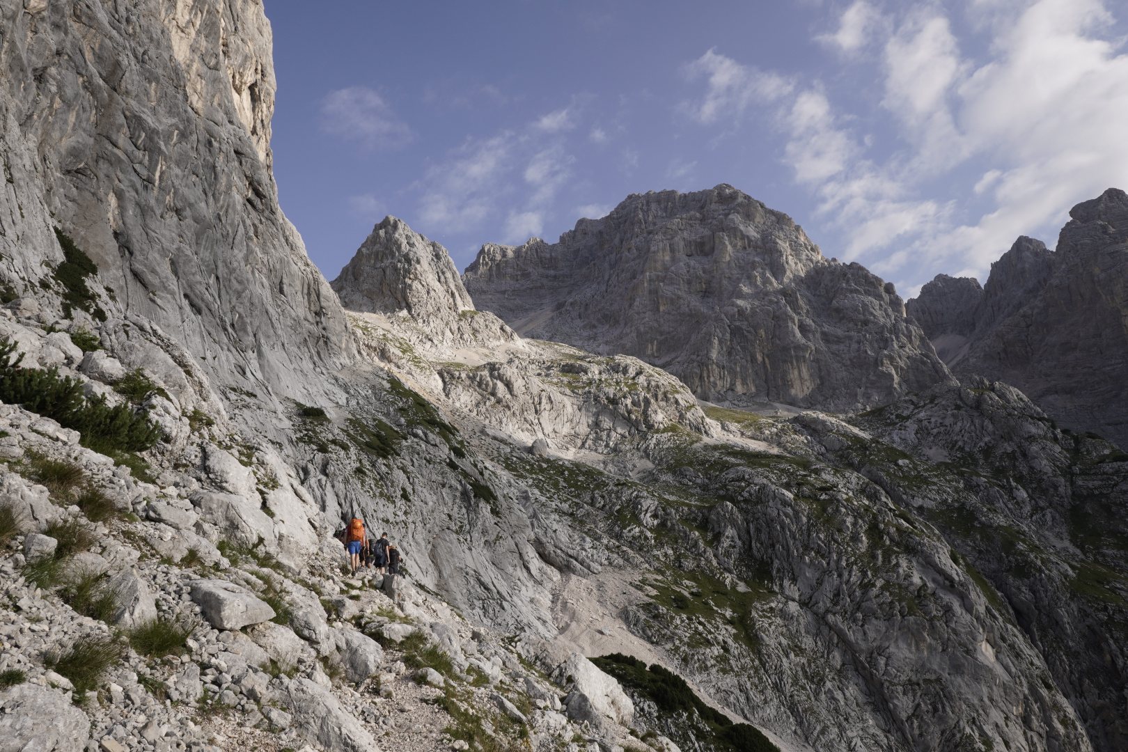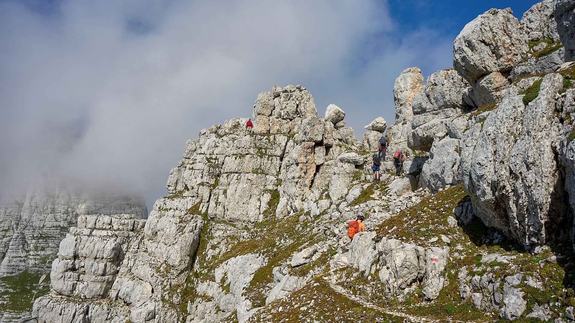 kompleti, vstopili v steno Špika nad Špranjo (2554 m). Pot je ves čas izpostavljena in