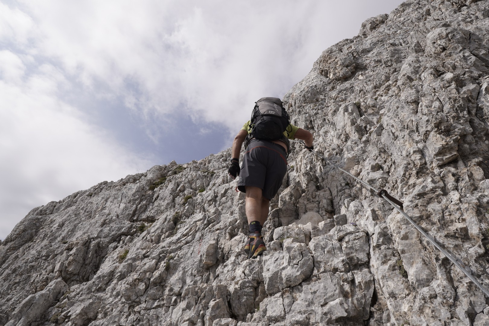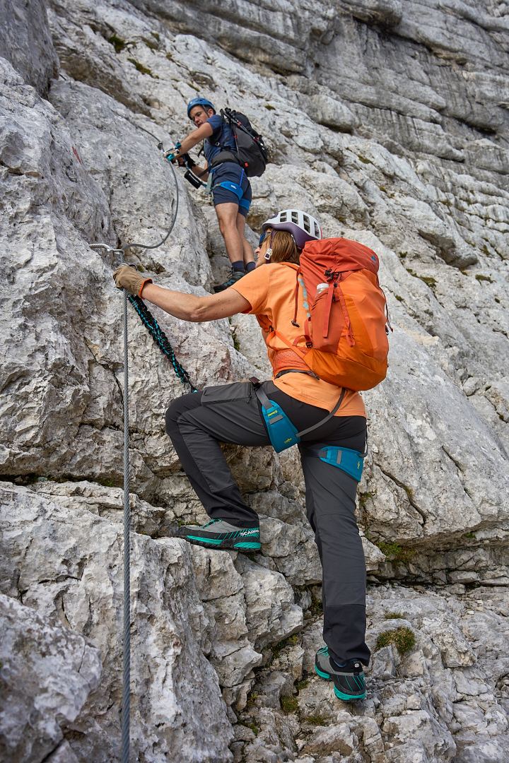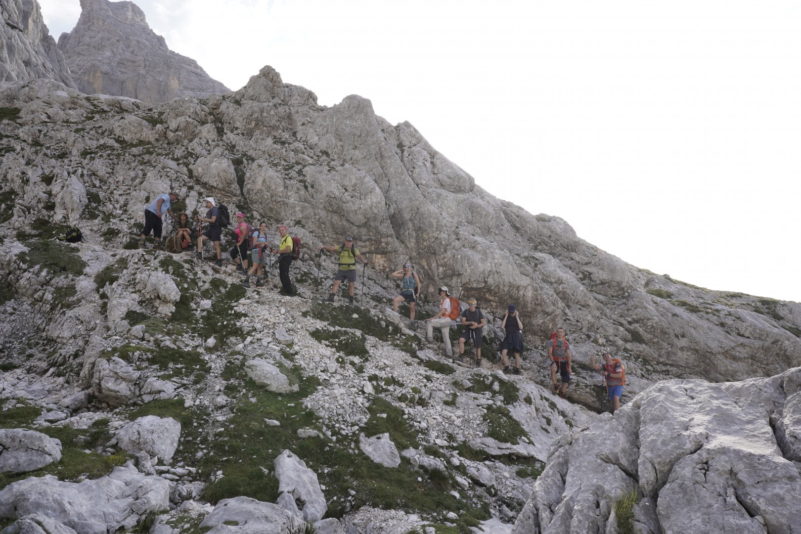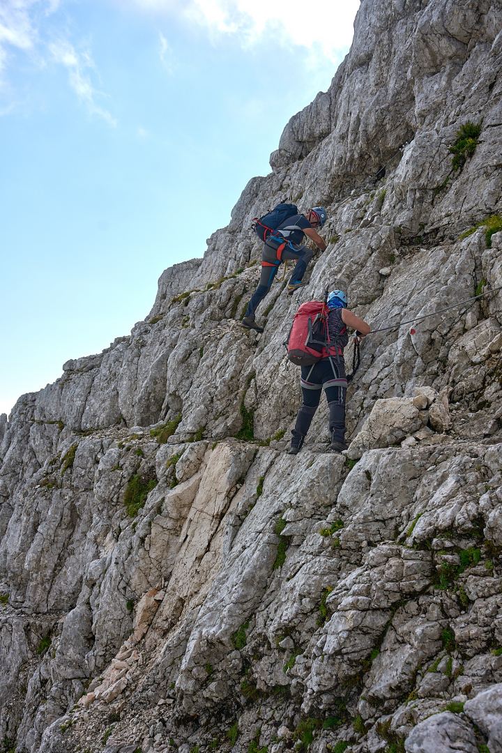 Po strmi, vijugasti poti med travmi smo hitro napredovali. Ves čas so nas spremljali kozorogi, ki so z neverjetno lahkotnostjo in eleganco premagovali največje strmine. Neverjetno. Tako od blizu jih le redko lahko opazujemo. Pred vstopom na pot Anite Goitan smo se opremili s čeladami, s plezalnimi pasovi in samovarovalnimi kompleti. Kasneje se je izkazalo, da nam je bila vsa oprema v veliko pomoč. Pot pod Koštrunovimi špicami je bila strma, prepadna, vendar dobro opremljena z varovali. Na posebej težkih odsekih so se Robi, Milan in še dva bolj izkušena pohodnika res potrudili in nam pomagali, da strah ni dobil preveč moči.