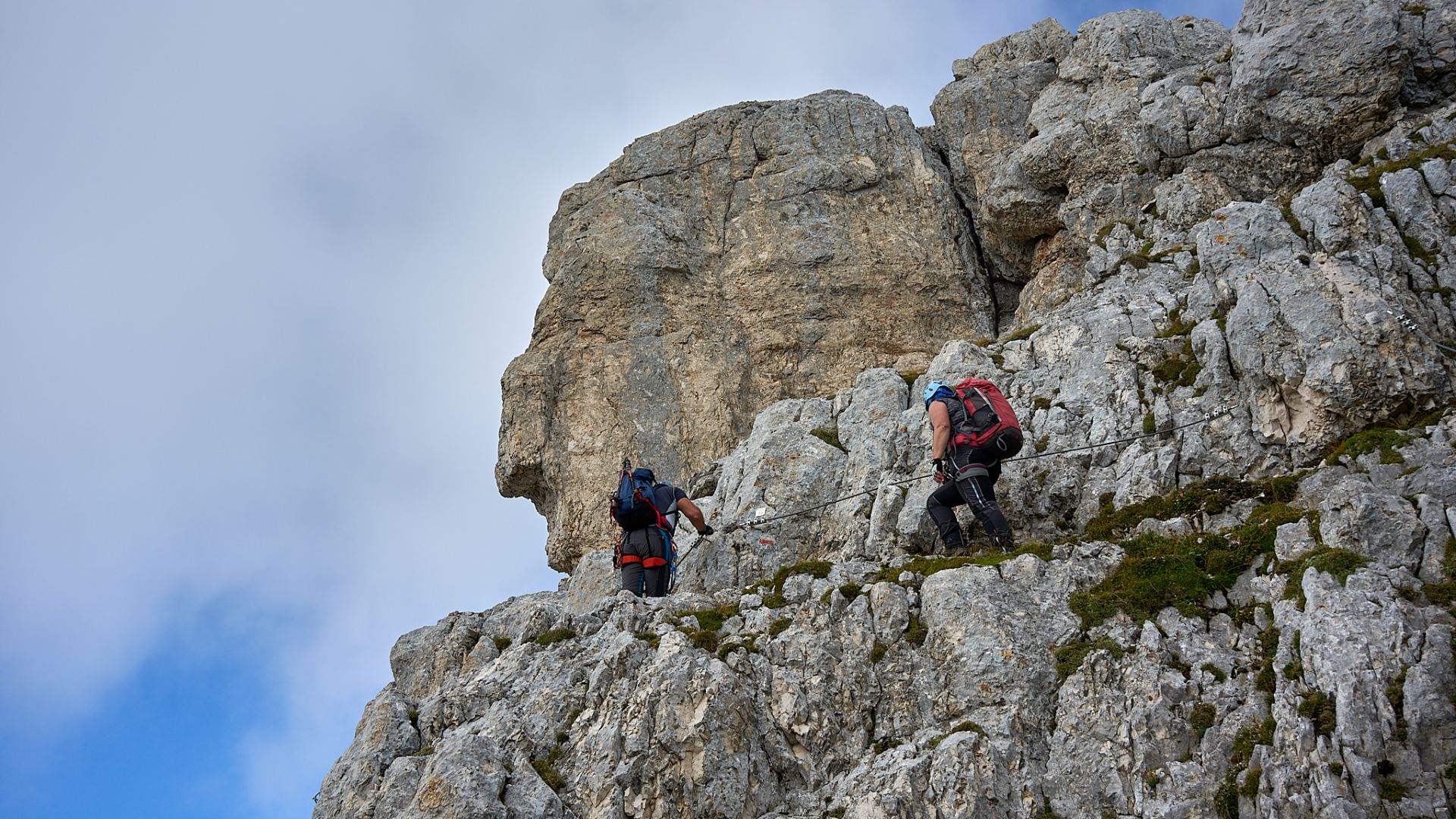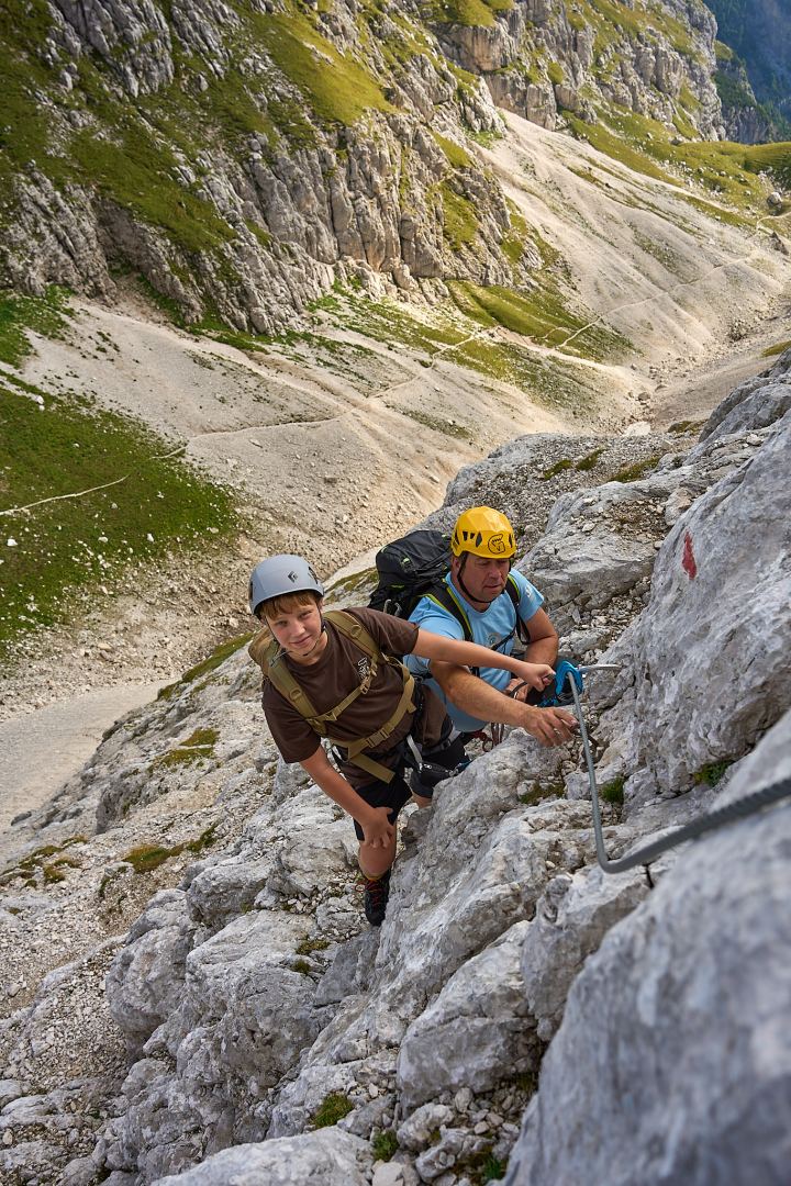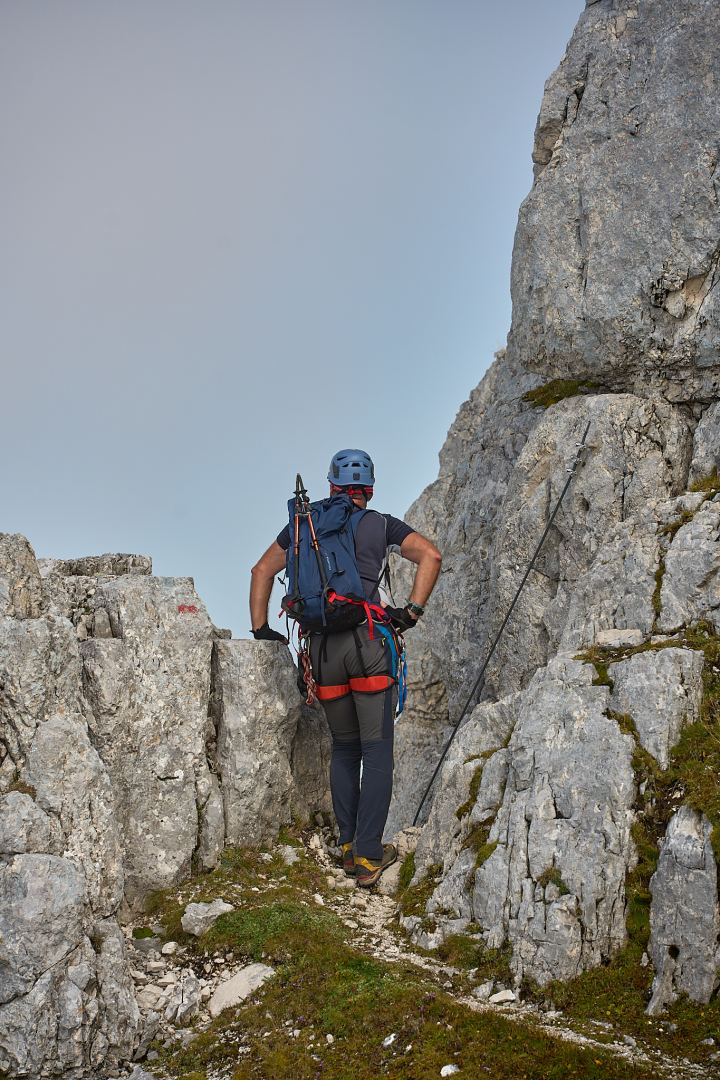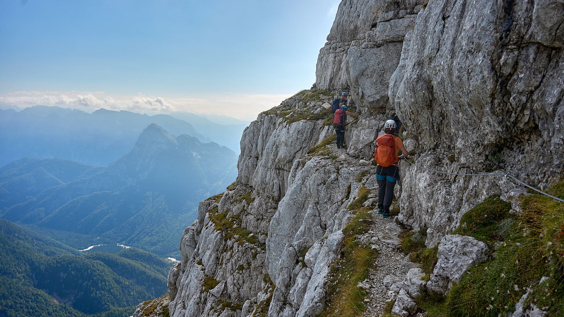 (2502 m), na levo pa smo, opremljeni s čeladami, plezalnimi pasovi in samovarovalnimi