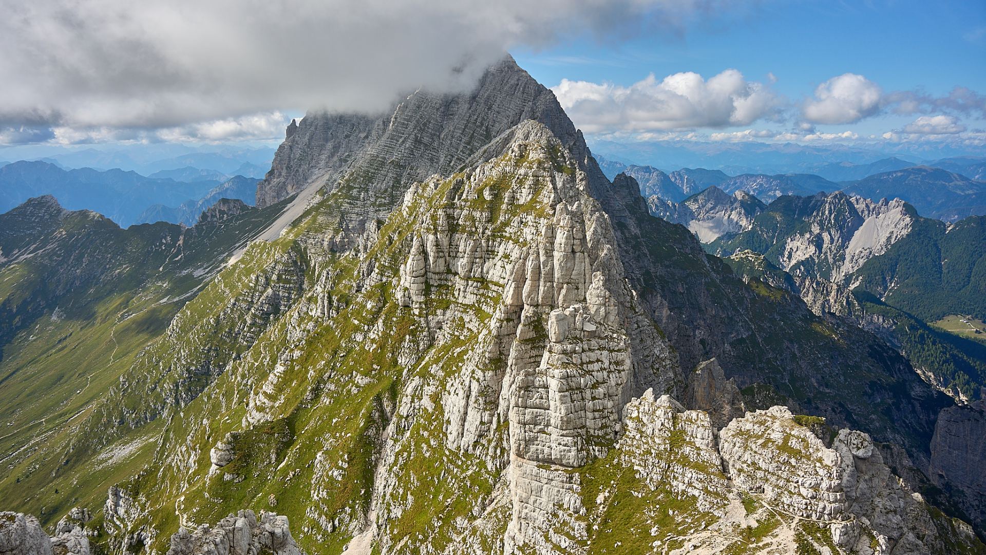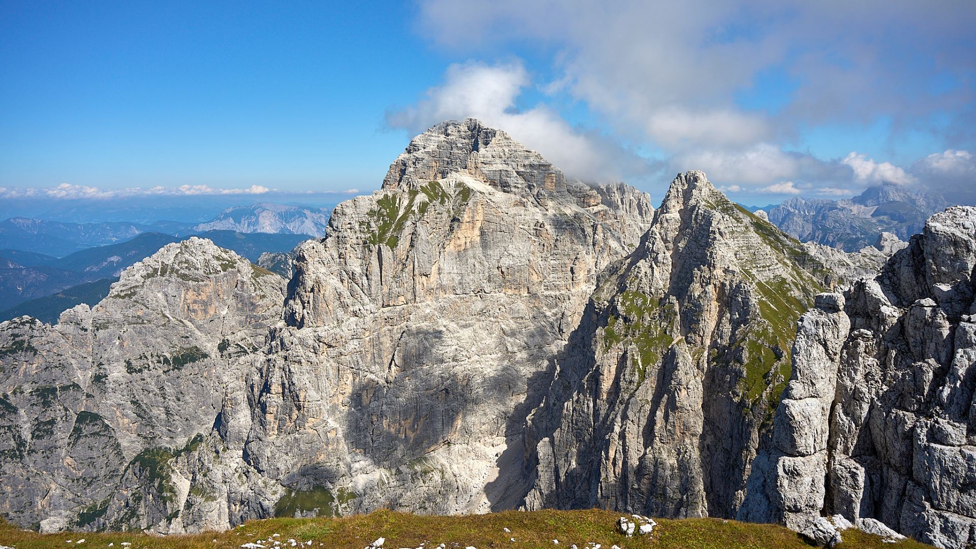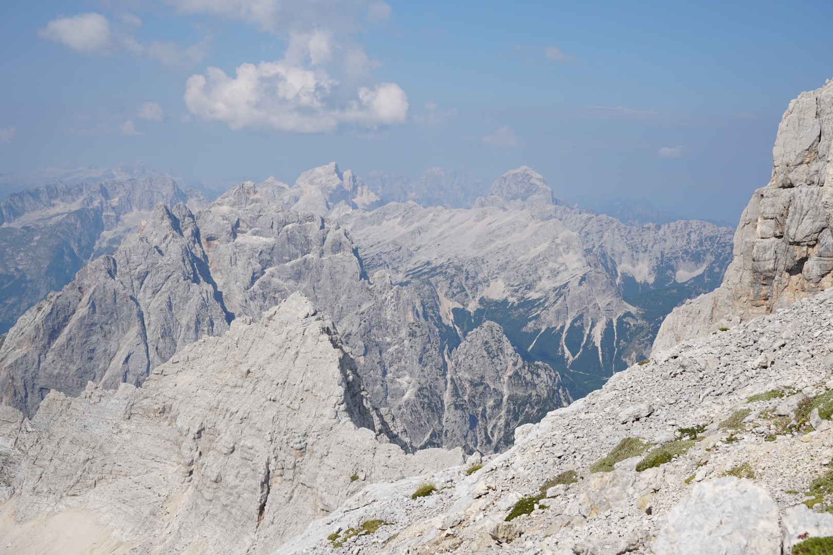 Višje kot smo bili, več panorame smo lahko občudovali. Iz ¨morja¨, ki so ga pod nami ustvarjali nizka oblačnost in megla so se kazali vsi najvišji vrhovi. Mangart, Jalovec, Triglav, Kaninsko pogorje, Montaž,… prečudovito. Da nam ni bilo preveč vroče so občasno poskrbeli oblaki, ki so se dvigali iz doline in izhlapeli višje nad nami. Malo pod vrhom smo na drugi strani v daljavi lahko občudovali pogled na Sv. Višarje. Do vrha ni bilo več daleč. Za nami je iz druge smeri prišla skupina planincev, tudi Slovencev.
