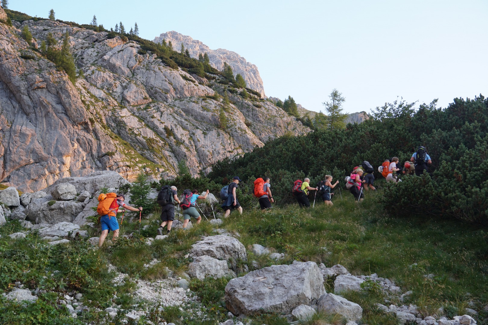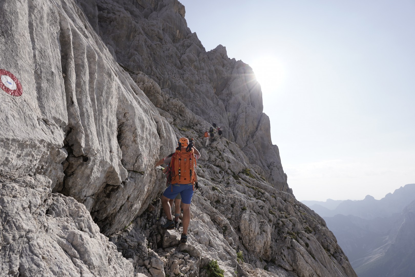 uspešnem vzponu. Celodnevna tura, težki nahrbtniki, čudoviti razgledi na sosednje gore,