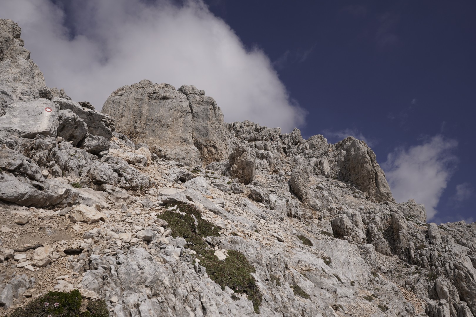 Škrbini prednje Špranje, kjer se pot razcepi. Na desno vodi pot proti vrhu Koštrunove špice