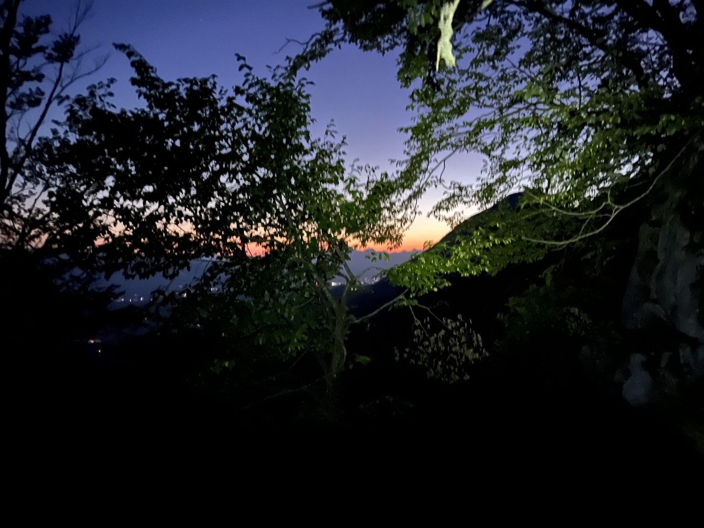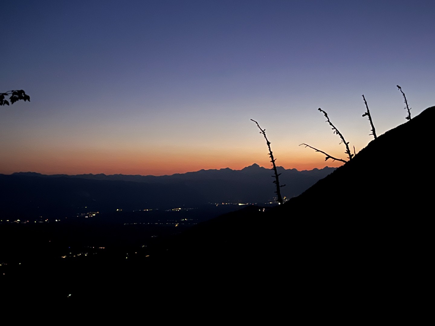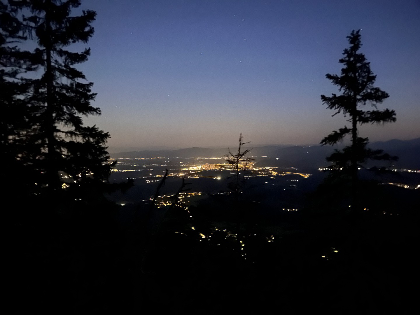 pod Storžičem. Hoditi smo začeli še brez naglavnih lučk. Ko je sonce povsem ugasnilo, luna