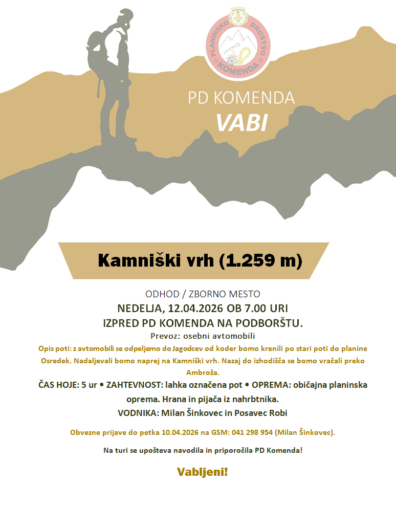 Vabilo vodnikov PD Komenda na Kokoš (676 m) dan pred kulturnim praznikom, 7. 2. 2026, je obetalo lahek, bolj turistični pohod.