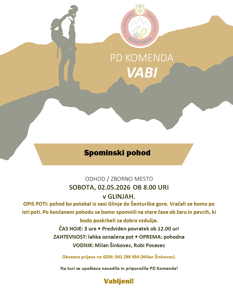Obveščamo vas, da bodo puhovke na voljo za pomerjanje v sredo, 15. 4. 2026, med 17.30 in 19.00 uro na sedežu Planinskega društva Komenda.